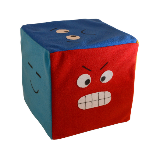 Muñecos de tela que representan 5 emociones básicas: rojo: enojo-rabia, azul: tristeza, rosado: felicidad-alegría, amarillo: asco/rechazo y verde: miedo-asombro.
