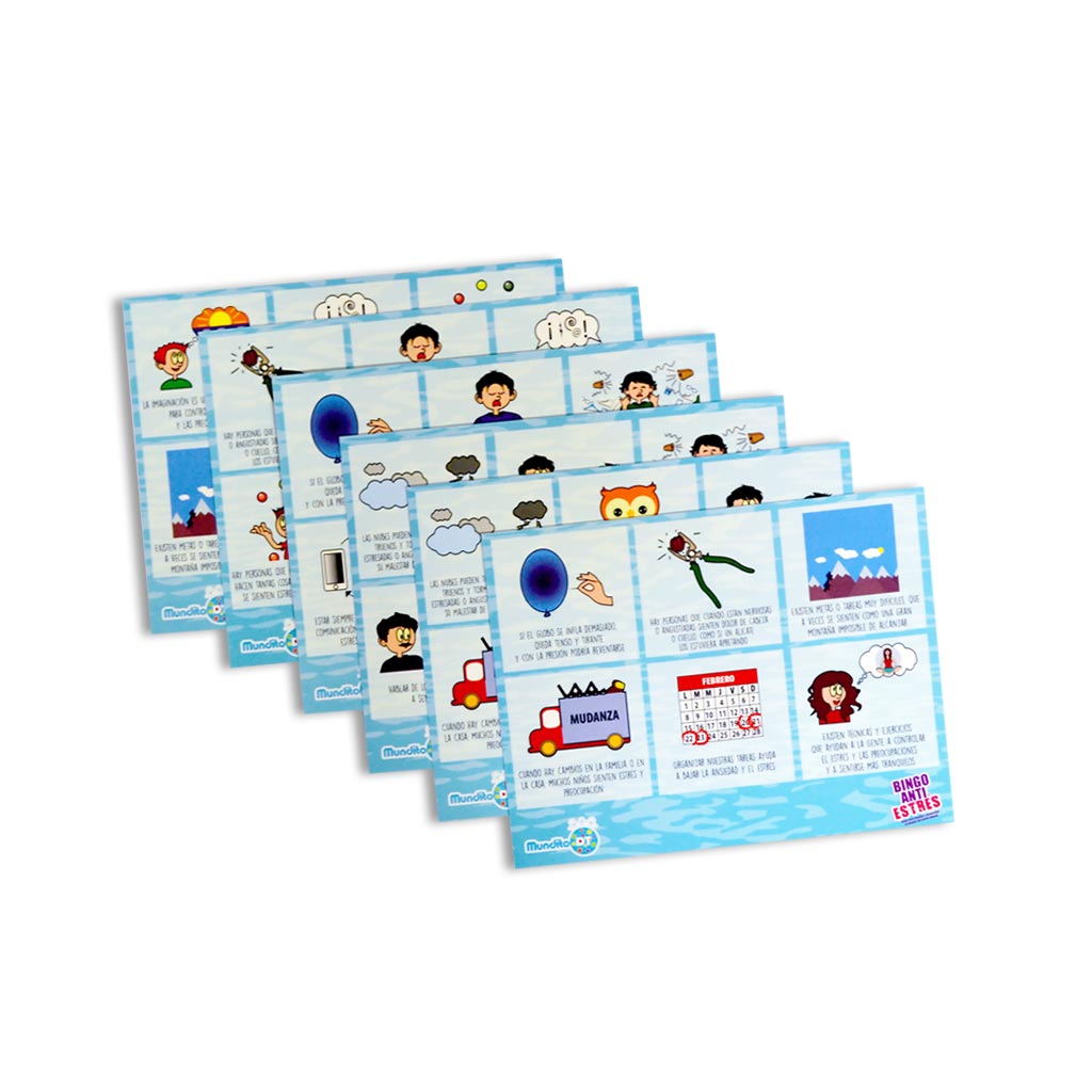 El Bingo Anti-Estrés está diseñado para abordar y tratar la ansiedad, la tensión y el estrés infantil. A través del juego se abre el diálogo sobre los sentimientos, el miedo en el que nos desenvolvemos y las conductas que contribuyen a aumentar nuestros niveles de ansiedad y estrés. Permite aprender a identificar los factores que generan estrés, y a su vez, aprender herramientas técnicas pasa disminuirlo. La dinámica del juego facilita la comunicación y apertura del niño, que de otra forma, puede ser difícil de obtener. El juego es útil para todo tipo de niños, no sólo para los que tienen un problema de estrés, ya que es un instrumento de comunicación, confianza y entretenimiento que facilita el proceso comunicativo en general.