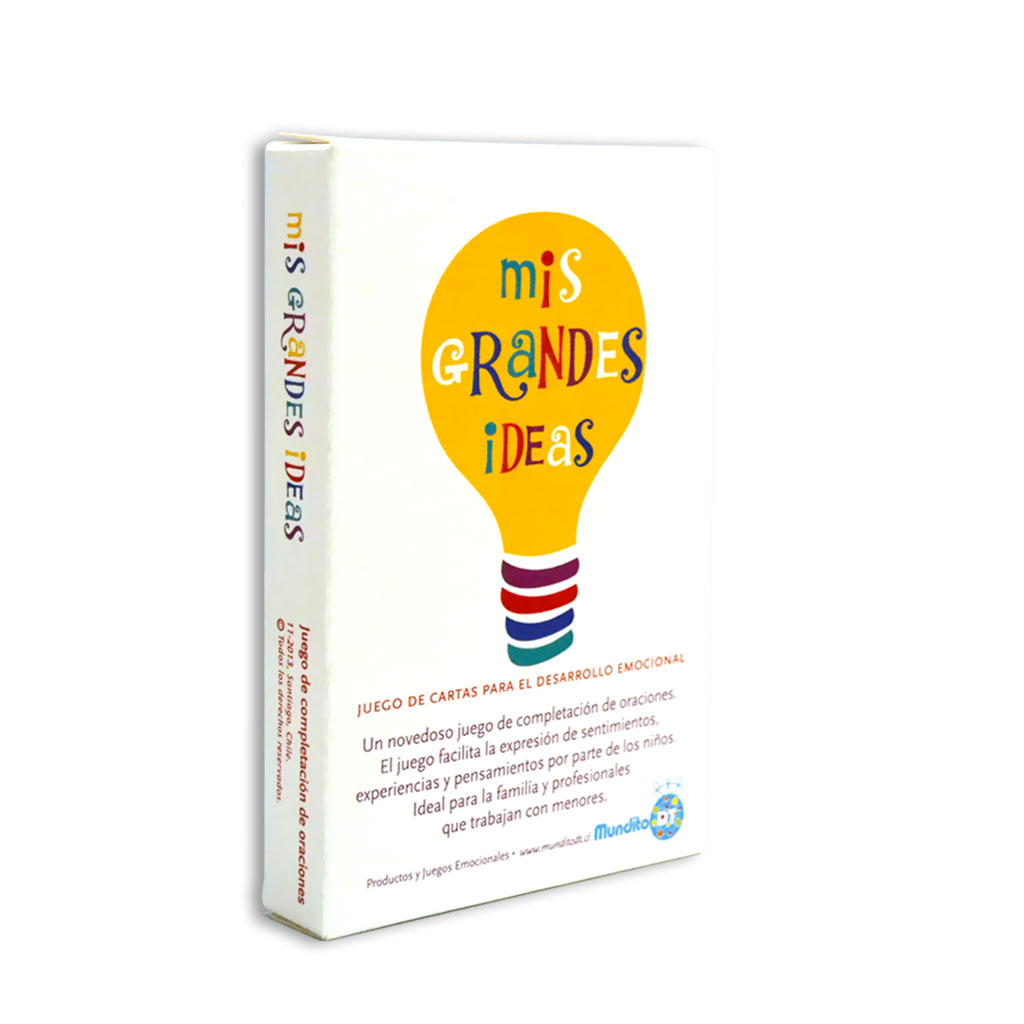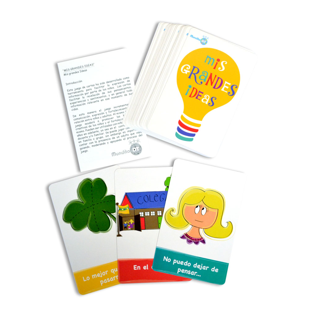Un novedoso juego de cartas de completación de oraciones que facilita la expresión de sentimientos, experiencias y pensamientos por parte de los niños. Herramienta ideal para padres y profesionales que trabajan con menores. El juego contiene 34 cartas que abarcan una variedad de temas importantes, incluyendo relaciones sociales, auto-estima, familia, emociones y la visión del mundo por parte del menor. A través del juego se facilita el conocimiento, comunicación y se fortalece la relación entre el niño y el adulto.