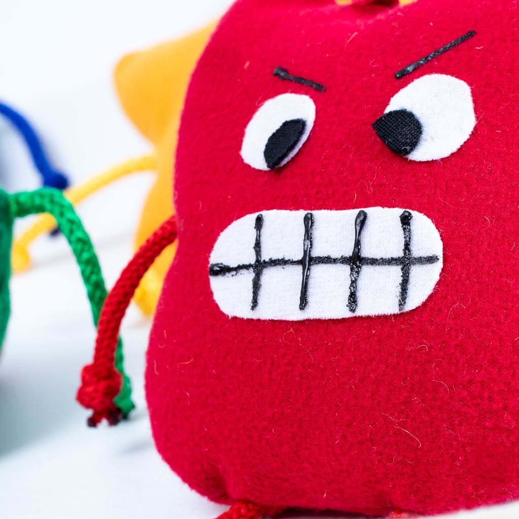 Muñecos de tela que representan 5 emociones básicas: rojo: enojo-rabia, azul: tristeza, rosado: felicidad-alegría, amarillo: asco/rechazo y verde: miedo-asombro.